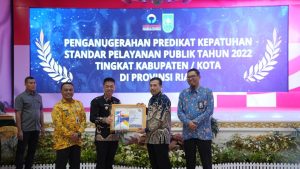 Dengan penilaian itu, Ombudsman RI menyerahkan Piagam penghargaan predikat kepatuhan standard pelayanan publik tahun 2022 yang diterima langsung oleh Bupati Rohil Afrizal Sintong, Pada hari Selasa 28/02/2023 di Balai Serindit Pekanbaru.
