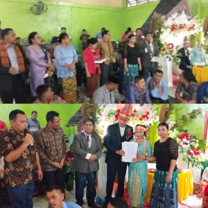 Meirlina dalam kesempatan tersebut menyampaikan’ Penyerahan surat administrasi kependudukan yang berupa Akte Pernikahan Sipil, Kartu Keluarga ( KK ) Kartu Tanda Kependudukan ( KTP ) menyatakan bahwa sepasang pengantin tersebut dinyatakan sah menjadi pasangan suami – istri secara Agama Kristen dan Negara Republik Indonesia’ ucapnya